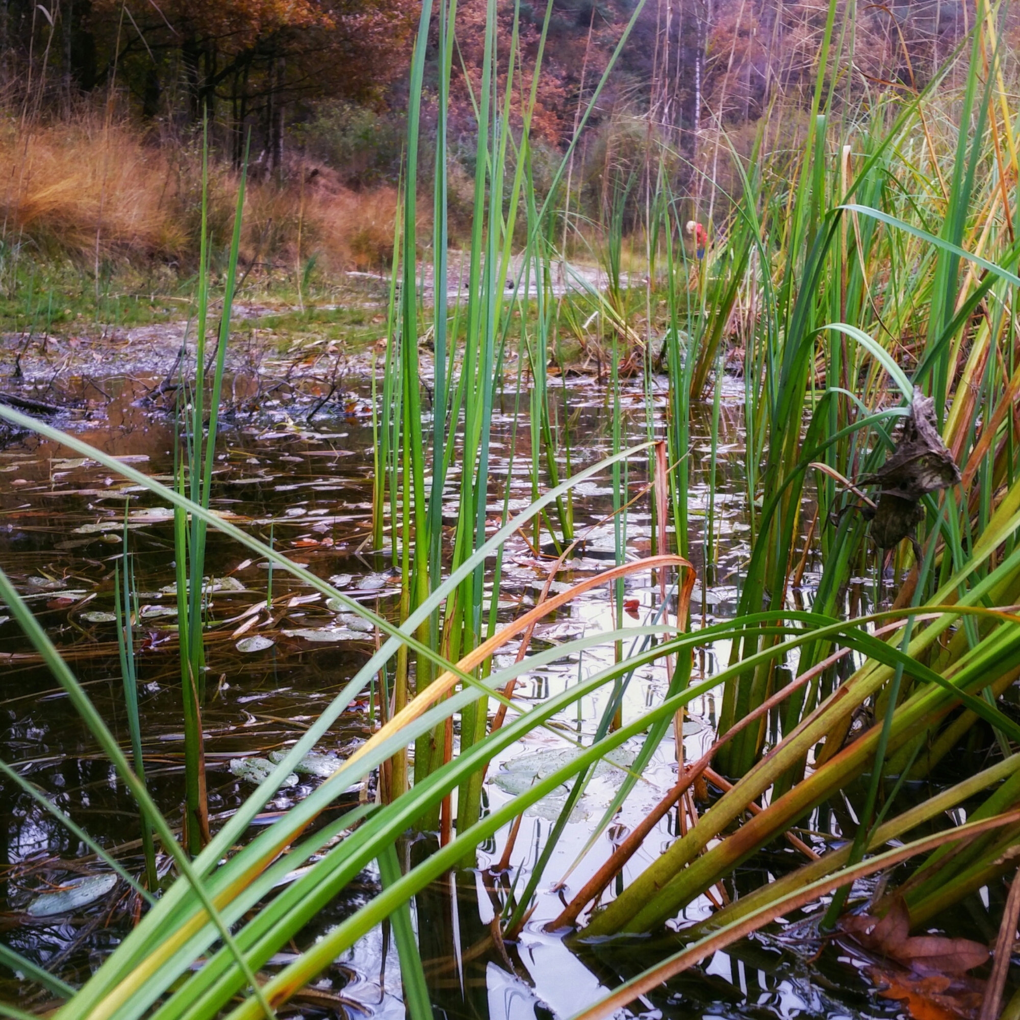 De wind houdt zich (in tegenstelling tot vandaag) nog rustig, regen nadert. De frisse herfstkleuren in het bos maken plaats voor bruin en grauwte… en dan, bij het water, groen! Lente achtig groen, met een vleugje herfst. Fins Meertje 2016