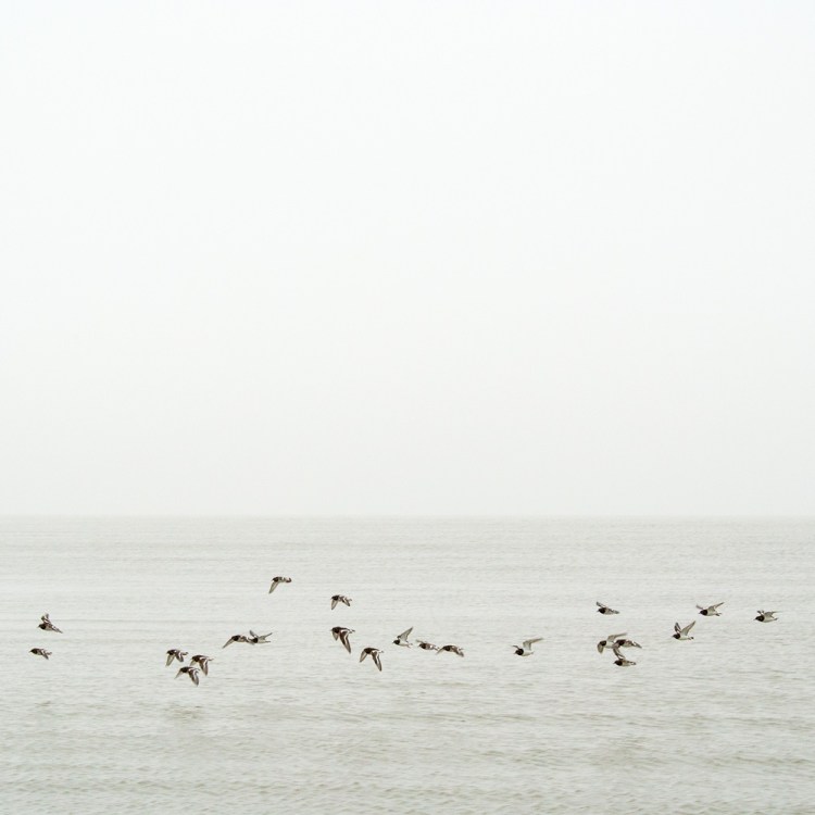 Ik kijk door mijn zoeker naar de leegte waarbij de zee bijna grenzeloos overgaat in de grijze lucht. Kleine golfjes op de voorgrond helpen herinneren dat het echt is en geen plaatje. Dan vliegt plots een zwerm vogels mijn zoeker binnen en als een reflex druk ik op de ontspanknop… Moddergat #03, 2017