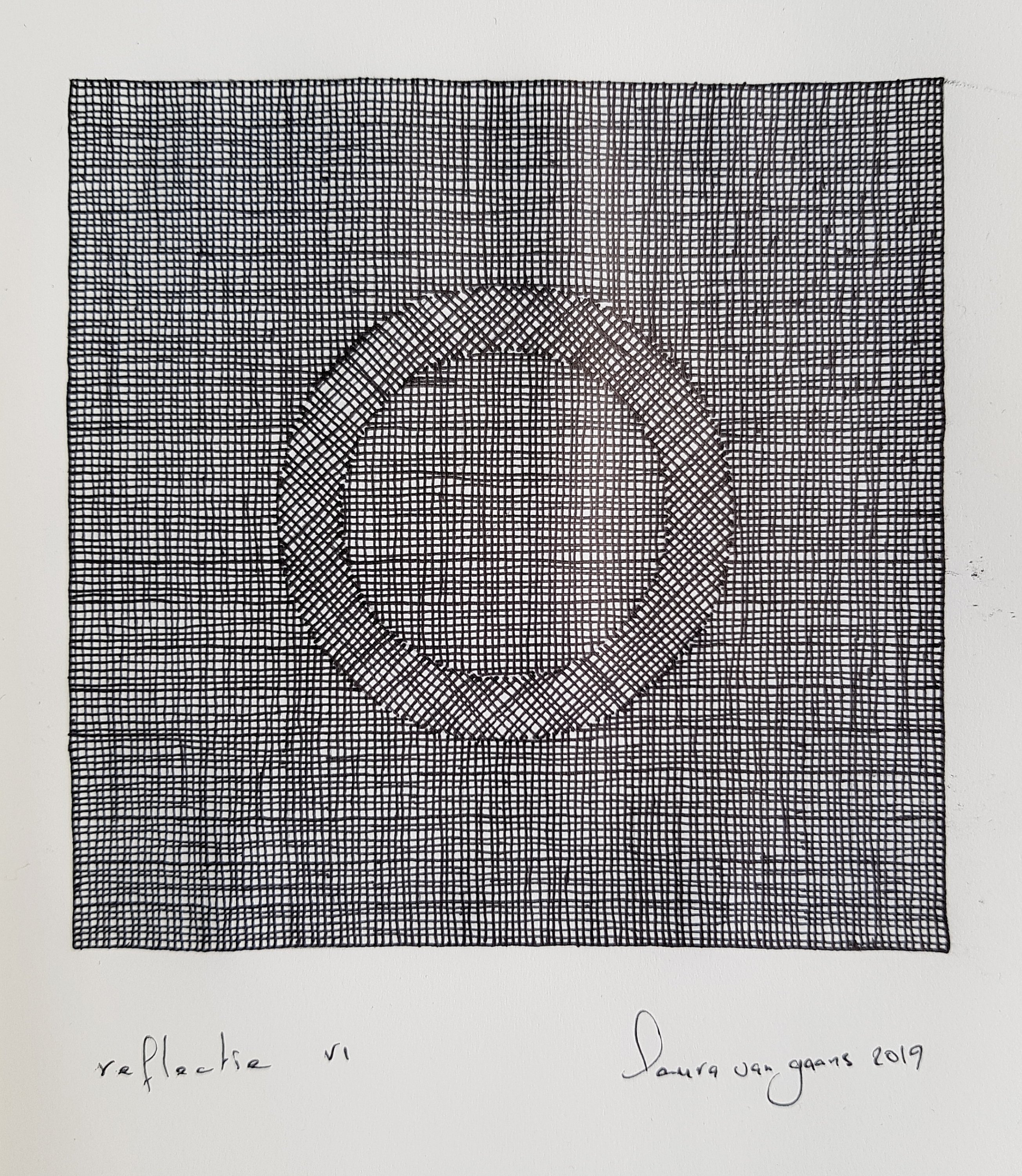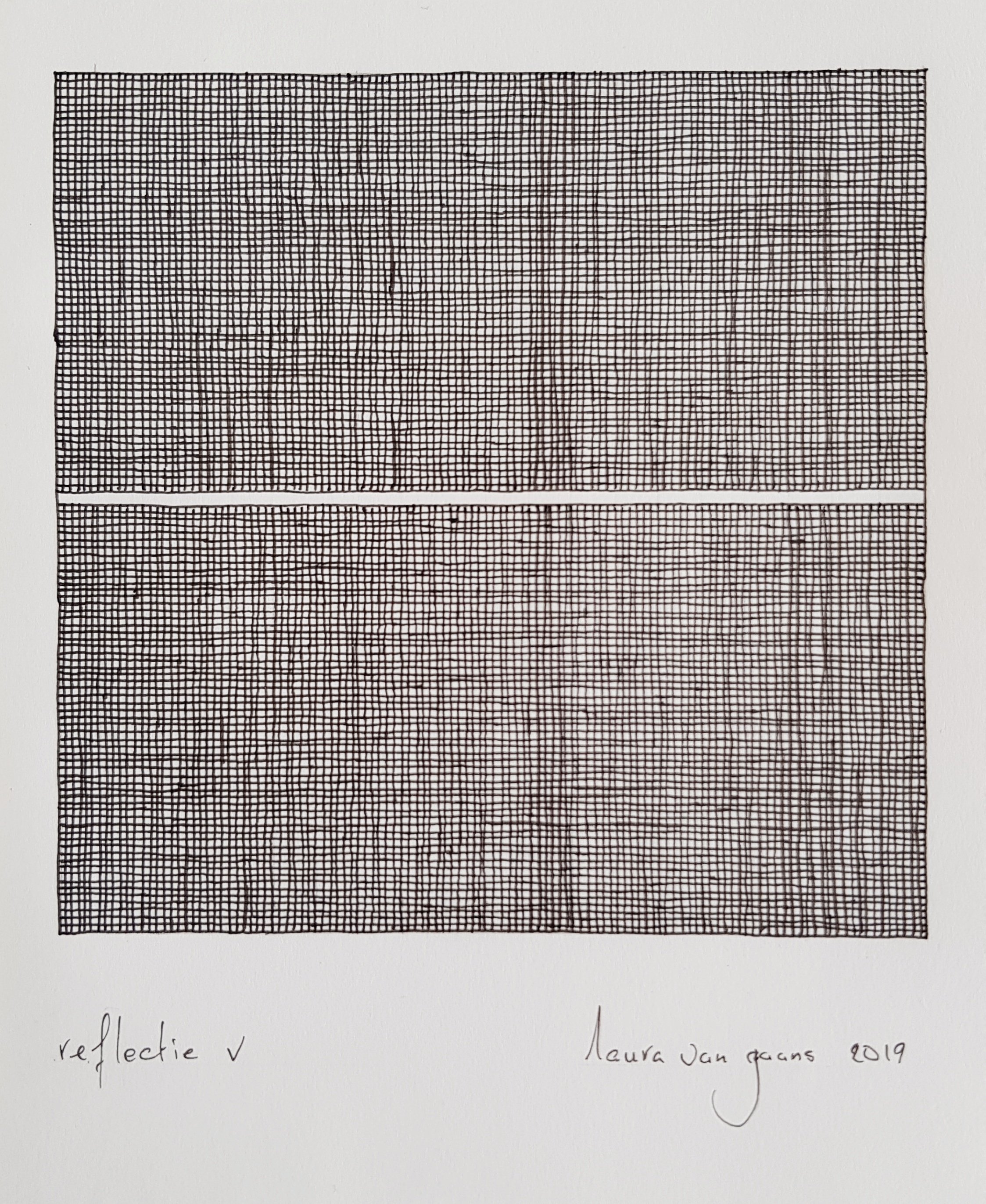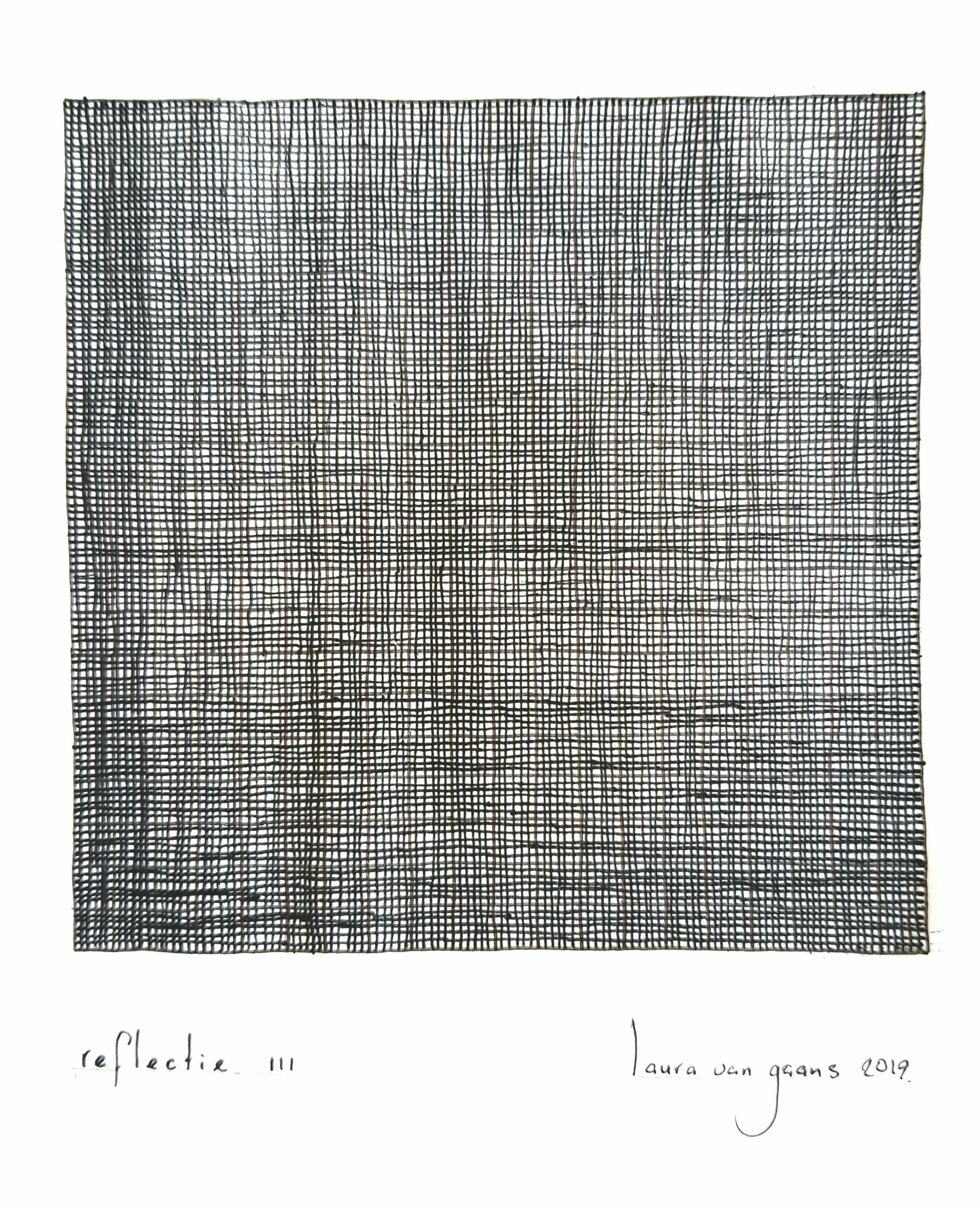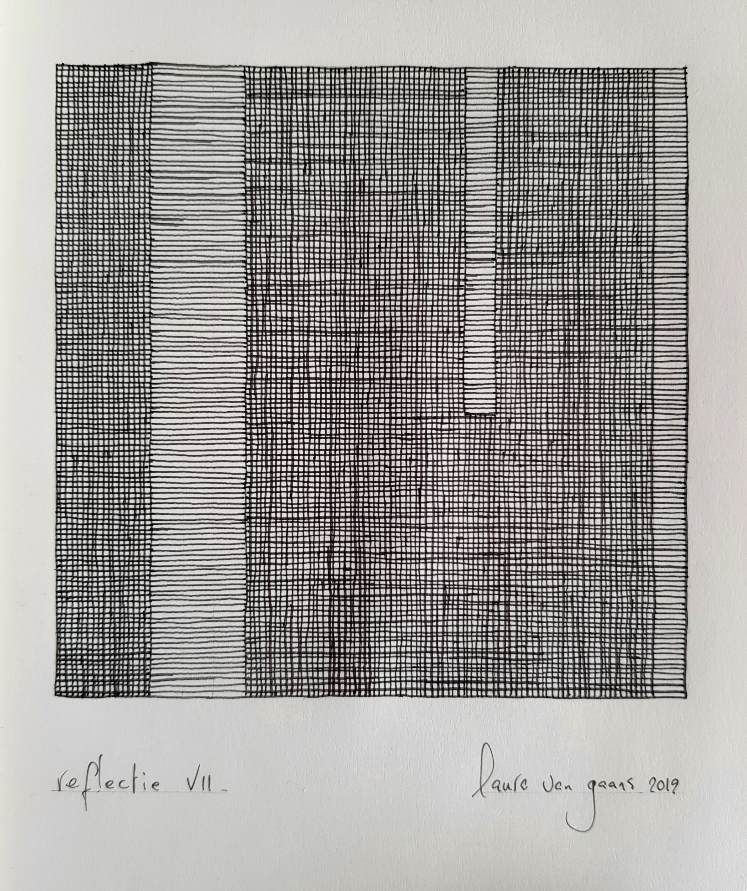 Mijn reflecties vertellen een ander verhaal. Of juist geen verhaal. De serie is ontstaan uit de behoefte los te komen van het denken. Een gelijkmatig raster vormt de basis, Oost-Indische inkt en kroontjespen doen de rest. Tekeningen waarbij eenvoud de boventoon voert en emotie op de achtergrond blijft.
