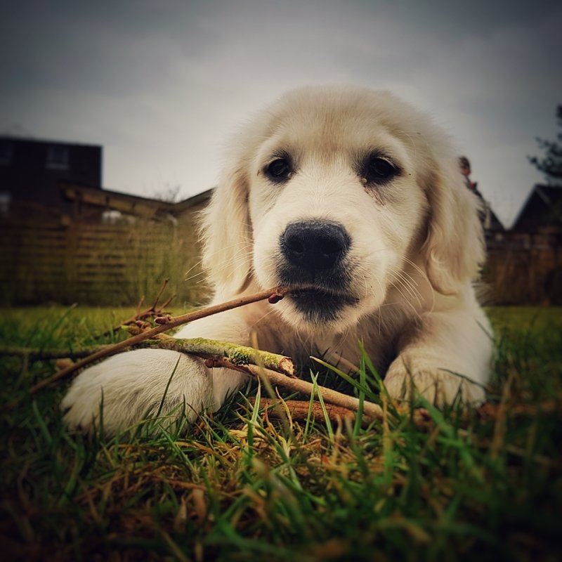 En daar is Emma, onze golden retriever van 11 weken oud. Heel lief, vrolijk, aanhankelijk en nog een béétje verlegen…